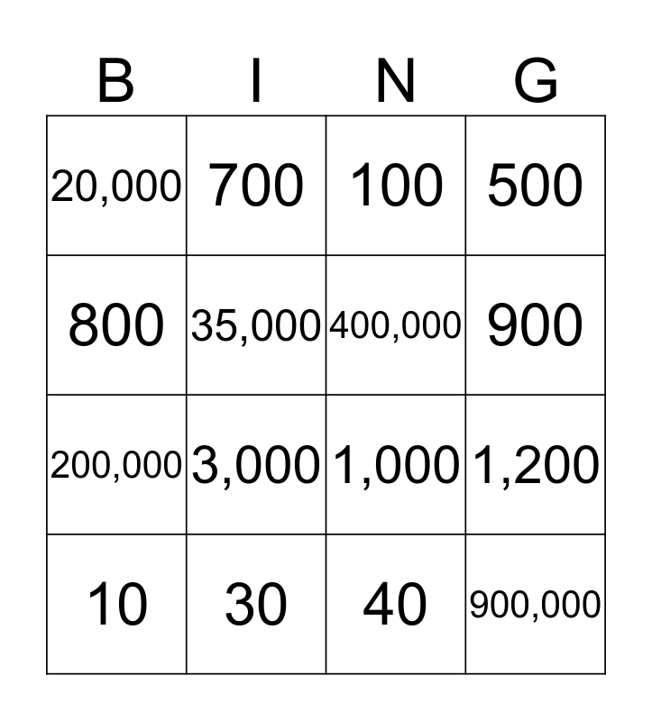 This bingo card has 16 words: 10, 30, 100, 500, 800, 700, 1,000, 1,200, 20,000, 35,000, 40, 900, 200,000, 3,000, 400,000 and 900,000.