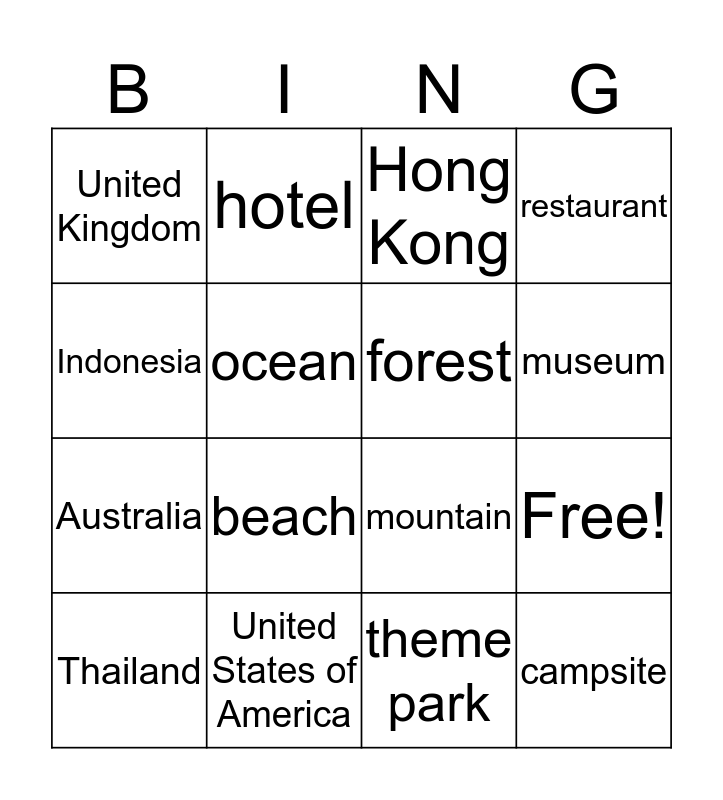 This bingo card has 20 words: Free!, China, Hong Kong, Singapore, Thailand, Indonesia, United States of America, United Kingdom, Australia, hotel, beach, mountain, ocean, campsite, forest, waterpark, museum, restaurant, theme park and zoo.