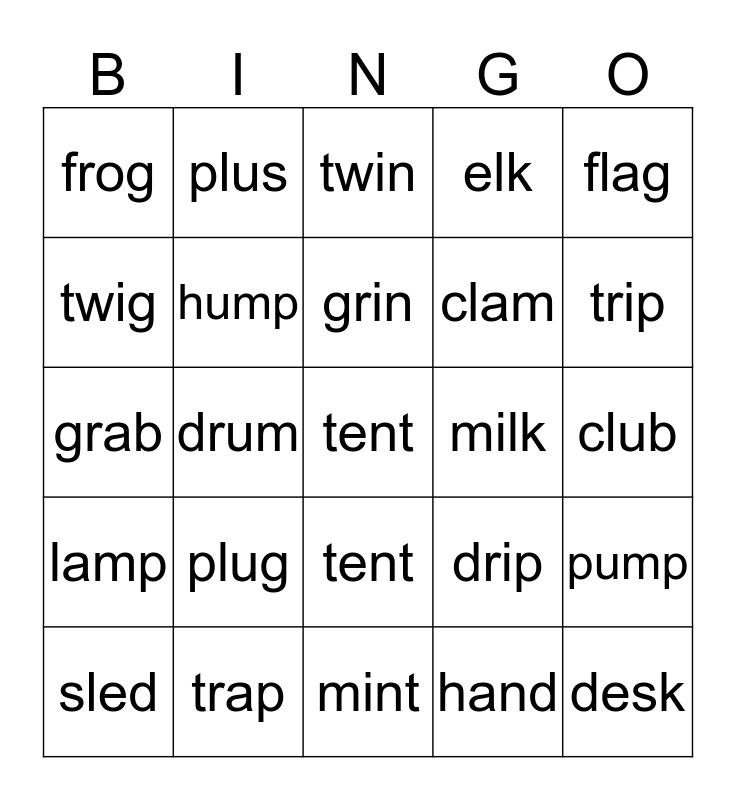 This bingo card has 30 words: sled, plum, grin, stop, flag, frog, plus, tent, milk, desk, lamp, hump, swim, hand, pump, bulb, drum, tent, drip, trip, grab, trap, twin, clam, club, twig, plug, mint, elk and elf.