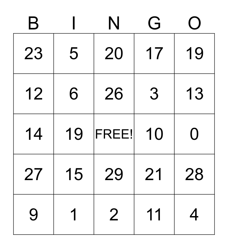 This bingo card has a free space and 24 words: 15, 1, 26, 9, 19, 23, 12, 5, 10, 29, 3, 14, 21, 28, 6, 11, 0, 20, 13, 19, 4, 27, 17 and 2.