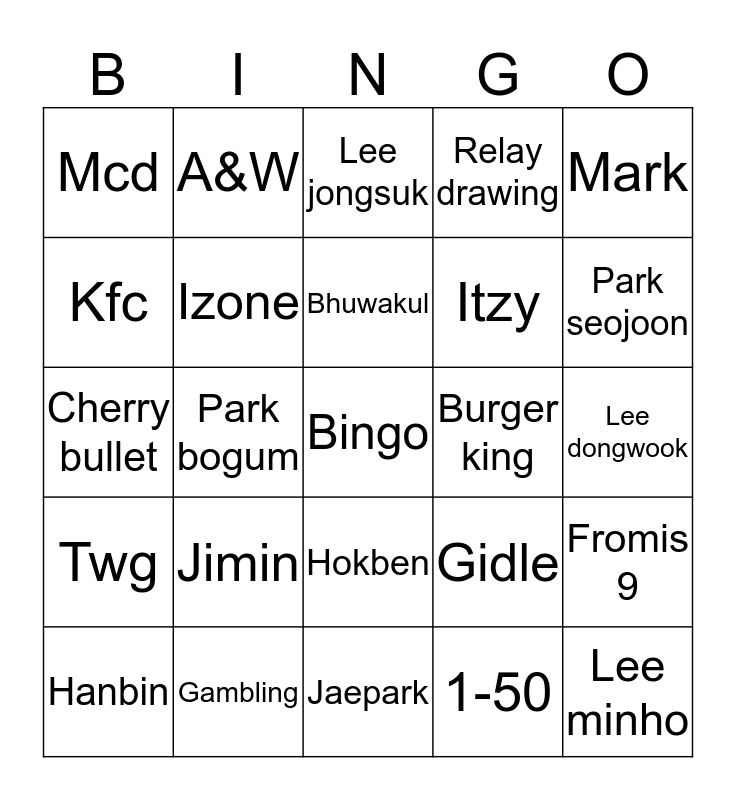 This bingo card has 25 words: Jimin, Jaepark, Bhuwakul, Hanbin, Mark, Mcd, Kfc, A&W, Burger king, Hokben, Itzy, Cherry bullet, Gidle, Fromis 9, Izone, Lee minho, Lee dongwook, Lee jongsuk, Park seojoon, Park bogum, Bingo, Gambling, Twg, Relay drawing and 1-50.