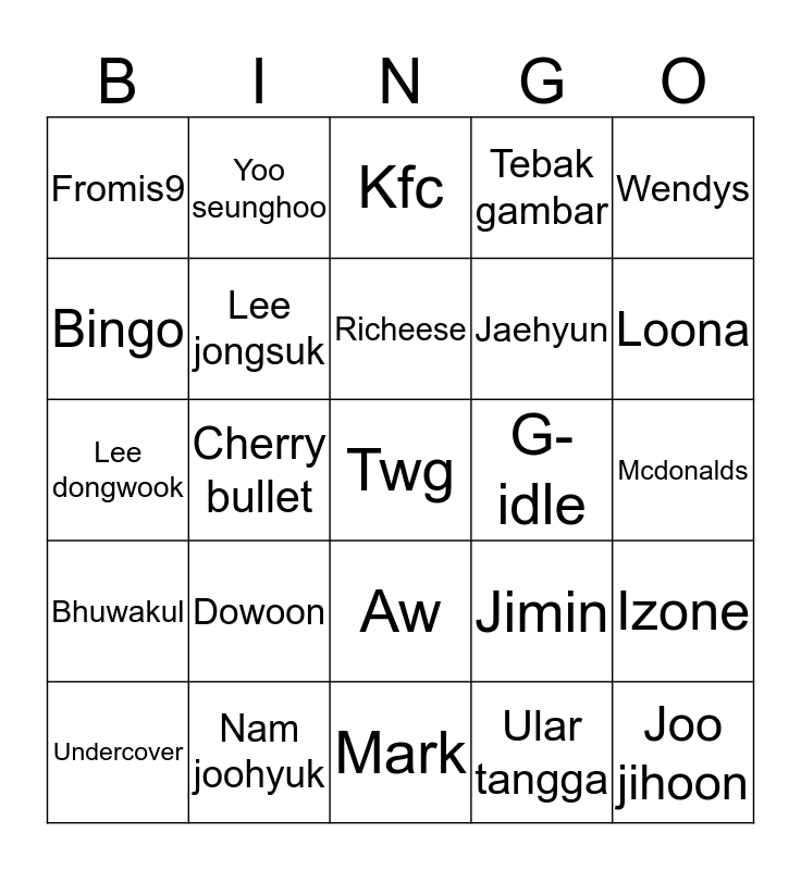 This bingo card has a free space and 24 words: Dowoon, Nam joohyuk, Richeese, Undercover, Wendys, Fromis9, Bingo, Yoo seunghoo, G-idle, Aw, Jaehyun, Lee dongwook, Jimin, Izone, Lee jongsuk, Ular tangga, Mcdonalds, Kfc, Loona, Cherry bullet, Joo jihoon, Bhuwakul, Tebak gambar and Mark.