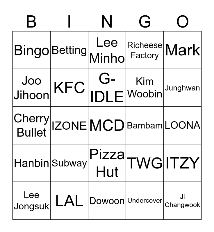 This bingo card has a free space and 24 words: Subway, LAL, G-IDLE, Lee Jongsuk, Mark, Bingo, Joo Jihoon, Betting, Bambam, Pizza Hut, Kim Woobin, Cherry Bullet, TWG, ITZY, KFC, Undercover, LOONA, Lee Minho, Junghwan, IZONE, Ji Changwook, Hanbin, Richeese Factory and Dowoon.