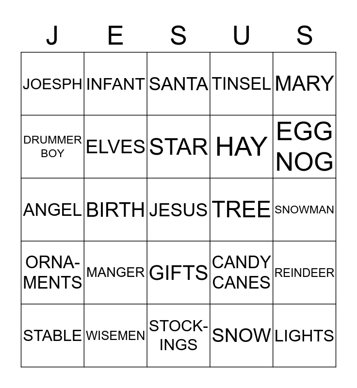 This bingo card has a free space and 24 words: MANGER, WISEMEN, STAR, STABLE, MARY, JOESPH, DRUMMER BOY, INFANT, TREE, GIFTS, HAY, ANGEL, CANDY CANES, REINDEER, ELVES, SNOW, SNOWMAN, SANTA, EGG NOG, BIRTH, LIGHTS, ORNA-MENTS, TINSEL and STOCK-INGS.