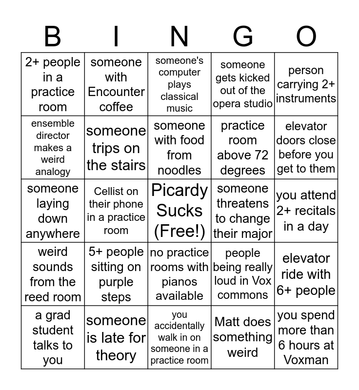 This bingo card has a free space and 32 words: Matt does something weird, Commons area smells like weird food, Cellist on their phone in a practice room, practice room with no stand, piano, or chair, weird sounds from the reed room, someone trips on the stairs, person carrying 2+ instruments, elevator ride with 6+ people, someone with Encounter coffee, someone with a venti Starbucks beverage, someone with food from noodles, someone's computer plays classical music, lights shut off while you're practicing, still in Voxman at 10 pm, someone threatens to change their major, someone dressed in a tux, a grad student talks to you, someone laying down anywhere, no practice rooms with pianos available, 5+ people sitting on purple steps, people being really loud in Vox commons, you hear a language besides English, you attend 2+ recitals in a day, someone is late for theory, you spend more than 6 hours at Voxman, someone gets kicked out of the opera studio, practice room above 72 degrees, ensemble director makes a weird analogy, 2+ people in a practice room, you accidentally walk in on someone in a practice room, awkward elevator ride and elevator doors close before you get to them.