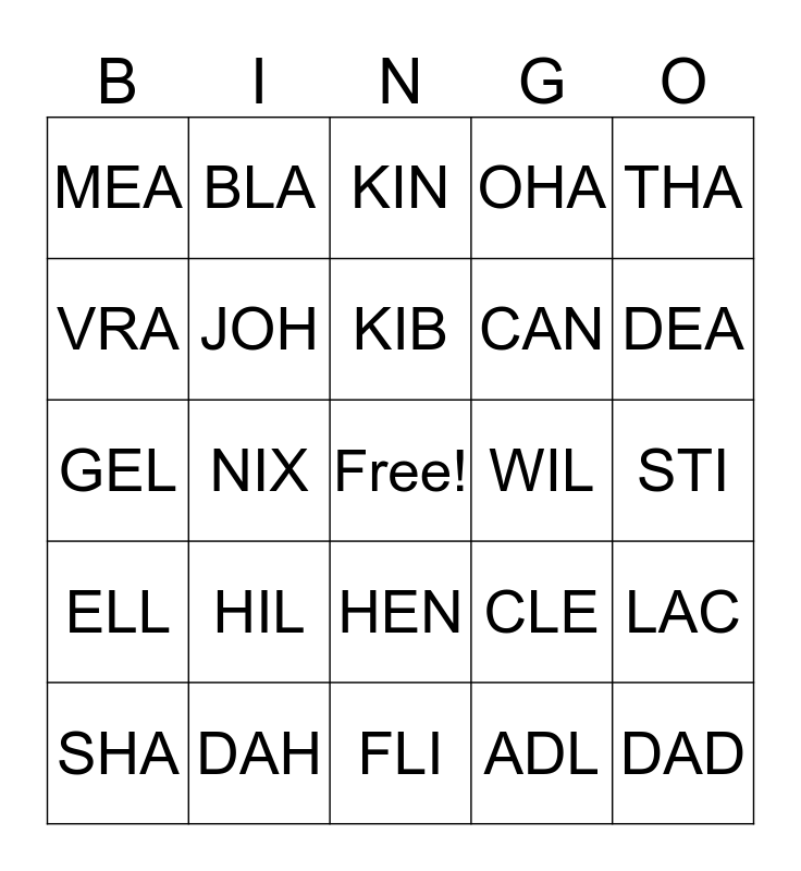 This bingo card has a free space and 32 words: ADL, ISA, NIX, ZIE, ELL, JOH, THA, LAC, BLA, PIL, KIB, KIN, BRU, MAD, WIL, ROY, SHA, GEL, HEN, HIL, CLE, OSB, STI, DAH, DAD, OHA, CAN, VRA, MEA, FLI, GRO and DEA.