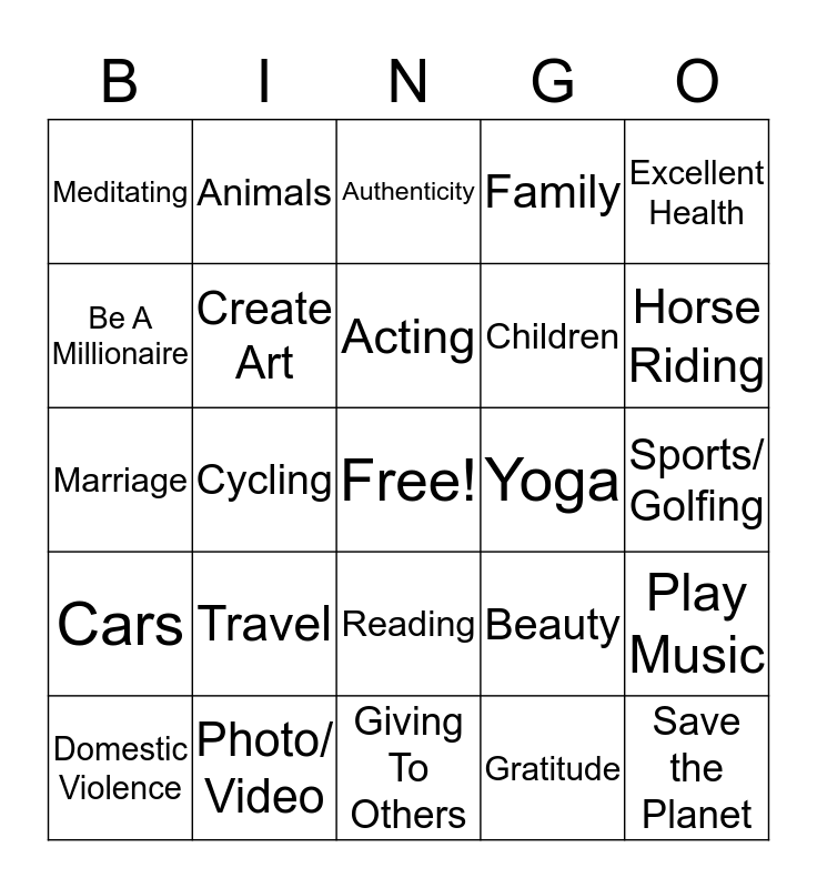 This bingo card has a free space and 37 words: God, Learning, Business, Create Art, Play Music, Travel, Acting, Having Fun, Excellent Health, Get Published, Cycling, Family, Save the Planet, Sports/ Golfing, Be A Millionaire, Cars, Gardening, Authenticity, Reading, Yoga, Meditating, Horse Riding, Domestic Violence, Giving To Others, Swimming, Gratitude, Animals, Public Speaking, Leadership, Foster Care, Community, Photo/ Video, Marriage, Women’s Ministry, Beauty, Children and Teenagers.