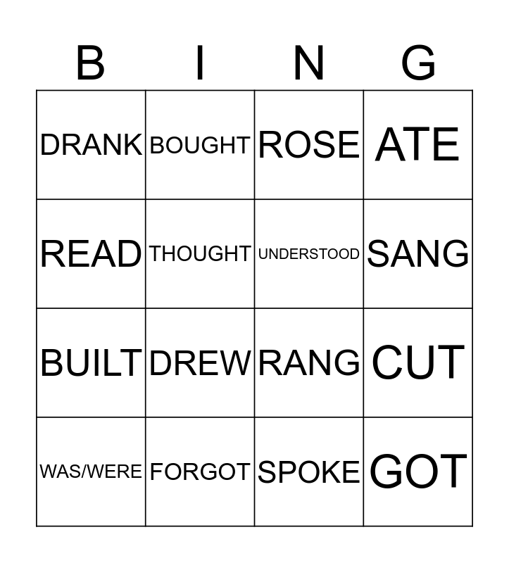 This bingo card has 47 words: Free!, WAS/WERE, DID, CAME, TOOK, WENT, BOUGHT, BROUGHT, THOUGHT, WROTE, UNDERSTOOD, ATE, SWAM, HAD, LEFT, MADE, SANG, FORGOT, TOLD, READ, CUT, PUT, DRANK, BUILT, CAUGHT, DREW, FELL, FOUND, FOUGHT, GOT, HIT, KEPT, SAW, SOLD, SAT, SLEPT, SPOKE, THREW, WOKE, WROTE, SENT, ROSE, RANG, SAID, LOST, FLEW and BIT.