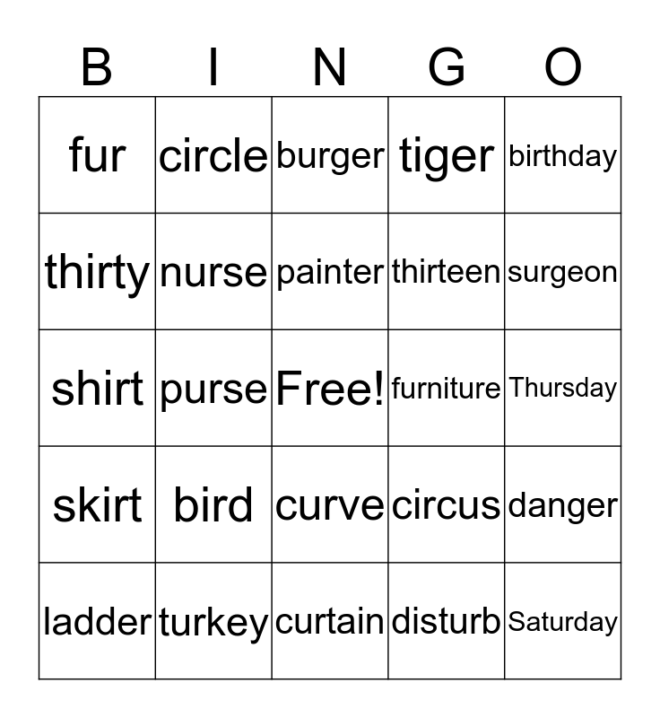 This bingo card has a free space and 30 words: turkey, purple, purse, curl, fur, burger, nurse, curve, furniture, curtain, Thursday, Saturday, disturb, surprise, surgeon, dirty, circus, skirt, bird, birthday, shirt, girl, circle, thirteen, thirty, tiger, danger, ladder, painter and hammer.