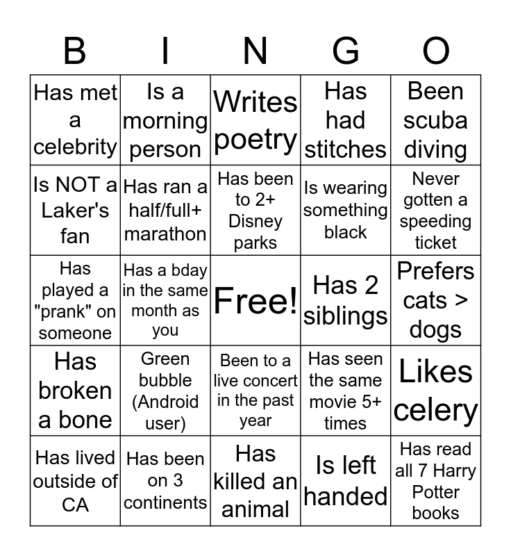 This bingo card has a free space and 29 words: Has lived outside of CA, No Netflix subscrip- tion, Has a bday in the same month as you, Knows how to Snowboard, Has met a celebrity, Writes poetry, Has ran a half/full+ marathon, Green bubble (Android user), Has 2 siblings, Has been on 3 continents, Prefers cats > dogs, Has read all 7 Harry Potter books, Has killed an animal, Is left handed, Never gotten a speeding ticket, Has played a sport in HS, Been to a live concert in the past year, Has broken a bone, Been scuba diving, Has played a "prank" on someone, Has seen the same movie 5+ times, Has an interesting sleep habit, Is wearing something black, Is NOT a Laker's fan, Has had stitches, Is a morning person, Likes celery, Has been to 2+ Disney parks and Used to or still skateboards.