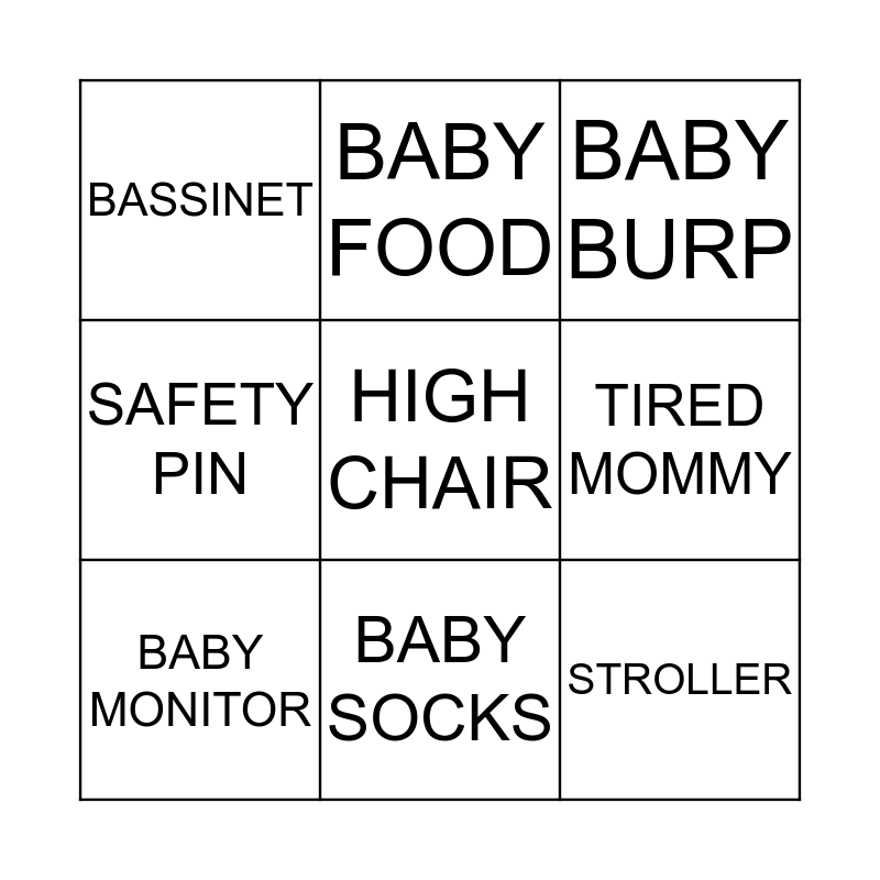 This bingo card has a free space and 35 words: CAR SEAT, BOTTLE, FORMULA, DIAPER, STORK, SAFETY PIN, LULLABY, BABY POWDER, THERMOMETER, ONESIE, STROLLER, BABY MONITOR, MOBILE, PACIFIER, BASSINET, CRADLE, RATTLE, BIB, CRYING, NURSERY, FUSSY, SWING, PLAY PEN, CRIB, BABY SOCKS, TIRED MOMMY, BOOTIES, RUBBER DUCK, BABY BURP, BABY LOTION, DIAPER BAG, BEDDING, PEDIATRICIAN, BABY FOOD and NAP TIME.