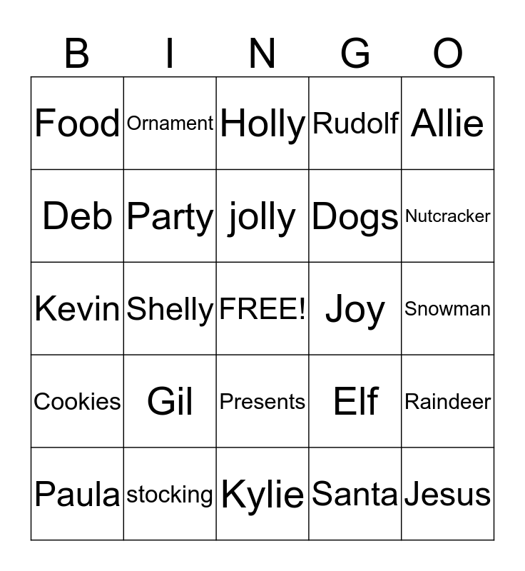 This bingo card has a free space and 24 words: Gil, stocking, jolly, Paula, Allie, Food, Deb, Ornament, Joy, Presents, Dogs, Kevin, Elf, Raindeer, Party, Santa, Snowman, Holly, Nutcracker, Shelly, Jesus, Cookies, Rudolf and Kylie.