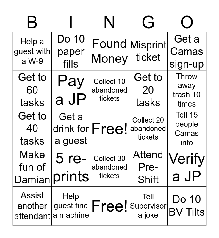 This bingo card has a free space and 24 words: 5 re-prints, Help guest find a machine, Collect 10 abandoned tickets, Assist another attendant, Get a Camas sign-up, Help a guest with a W-9, Get to 60 tasks, Do 10 paper fills, Collect 20 abandoned tickets, Collect 30 abandoned tickets, Get to 20 tasks, Get to 40 tasks, Attend Pre-Shift, Verify a JP, Pay a JP, Tell Supervisor a joke, Tell 15 people Camas info, Found Money, Throw away trash 10 times, Get a drink for a guest, Do 10 BV Tilts, Make fun of Damian, Misprint ticket and Free!.