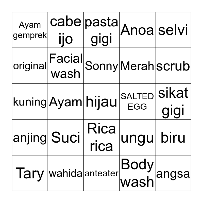This bingo card has a free space and 24 words: Suci, wahida, Sonny, Tary, selvi, Ayam gemprek, original, cabe ijo, SALTED EGG, Rica rica, Merah, kuning, ungu, biru, Facial wash, Body wash, sikat gigi, pasta gigi, scrub, Ayam, angsa, anjing, Anoa and anteater.