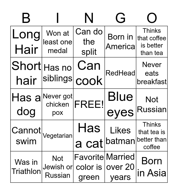 This bingo card has a free space and 32 words: Married over 20 years, Knows CPR, Never got chicken pox, Knows 4 languages or more, Cannot swim, Has no siblings, Thinks that coffee is better than tea, Thinks that tea is better than coffee, Won at least one medal, Knows the the answer to the ultimate question, Can cook, Can do the split, Been on all 5 continents, Never read a Harry Potter book, Blue eyes, Has taught or is a teacher, Was in Triathlon, Has a dog, Has a cat, Vegetarian, Likes batman, Not Jewish, Not Russian, Not Jewish or Russian, Born in Asia, Born in America, RedHead, Short hair, Long Hair, Favorite color is green, Over 6 feet tall and Never eats breakfast.