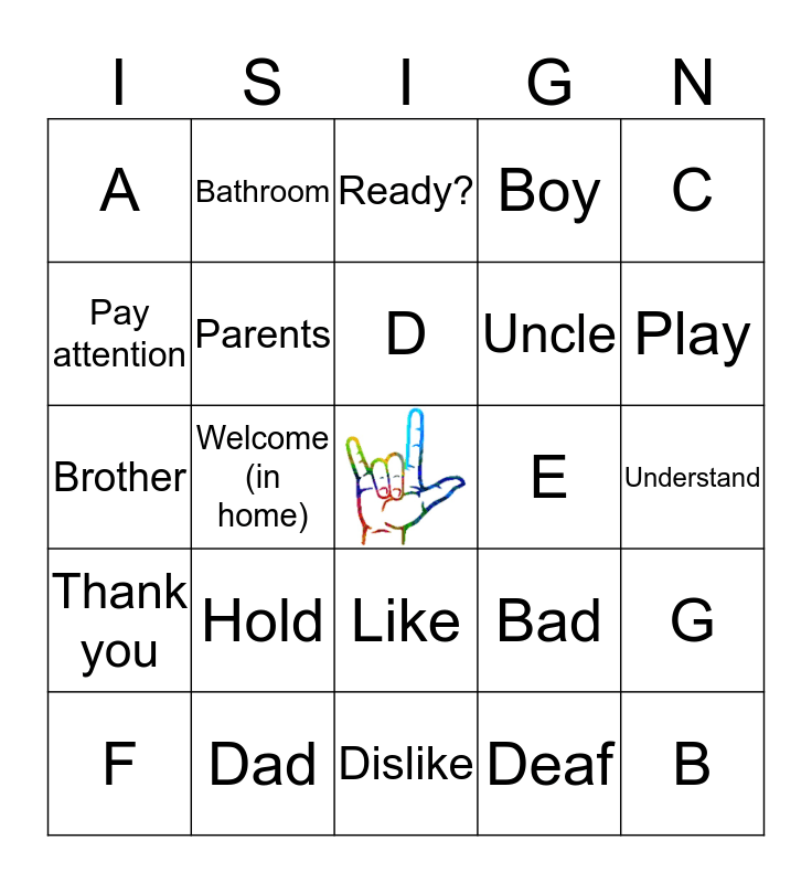 This bingo card has a free space and 60 words: Mom, Dad, Grandma, Thank you, Deaf, Hearing, Parents, Friend, Uncle, Grandpa, Boy, Girl, Pay attention, Help Me, Name, A, B, C, More, D, E, Ready?, F, G, H, Voice Off, Please, Stop, Play, Hungry, Parents, Thirsty, What's Up?, More, Bathroom, My, Me, Welcome (in home), Again, Brother, Sister, Hold, Understand, Good, Bad, Happy, Tired, Missed it, See ya Later, Like, Dislike, Now, Home, Cool, Cute, Work, Future, Learn, Whatcha doin? and Aunt.