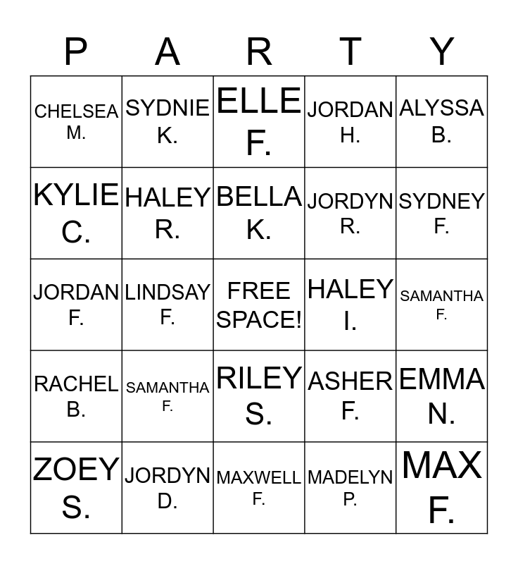 This bingo card has a free space and 24 words: SAMANTHA F., JORDYN D., BELLA K., ZOEY S., ALYSSA B., CHELSEA M., KYLIE C., SYDNIE K., HALEY I., RILEY S., JORDYN R., JORDAN F., ASHER F., EMMA N., HALEY R., MADELYN P., SAMANTHA F., ELLE F., SYDNEY F., LINDSAY F., MAX F., RACHEL B., JORDAN H. and MAXWELL F..