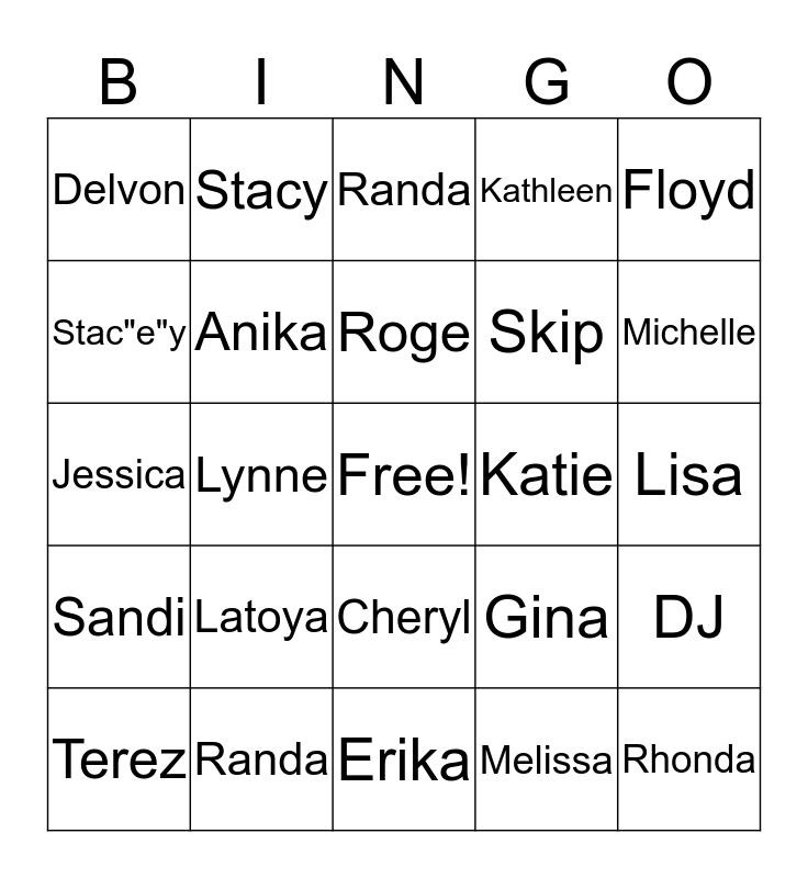 This bingo card has a free space and 24 words: Latoya, Randa, Roge, Terez, Floyd, Delvon, Stac"e"y, Stacy, Katie, Cheryl, Skip, Jessica, Gina, DJ, Anika, Melissa, Lisa, Randa, Michelle, Lynne, Rhonda, Sandi, Kathleen and Erika.