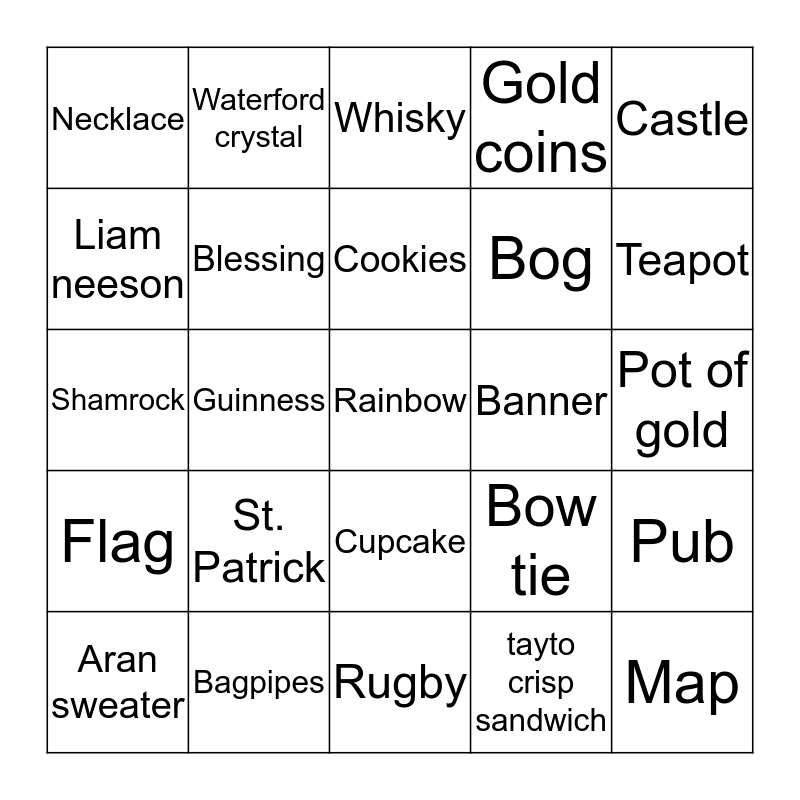 This bingo card has 41 words: Leprechaun, Shamrock, Boots, Blessing, Bagpipes, Cupcake, Cookies, Cake, Castle, Flag, Guinness, Gold coins, Rainbow, Pot of gold, Banner, St. Patrick, Farmhouse, Necklace, Potatoes, Whisky, Pub, Map, Rugby, Bog, Snake, China, tayto crisp sandwich, Hurling equipment, Teapot, Harp, Celtic cross, Waterford crystal, Aran sweater, Irish stew, Bow tie, Liam neeson, McDonalds shamrock milkshake, Lucky Charms, March, Green and Luck of the Irish.