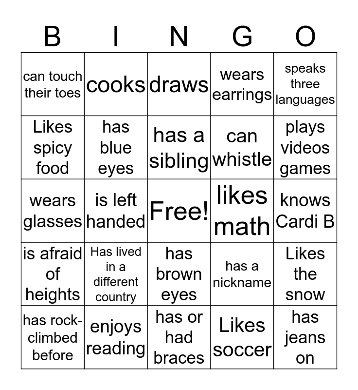 This bingo card has a free space and 24 words: Has lived in a different country, enjoys reading, has a sibling, has rock-climbed before, speaks three languages, can touch their toes, Likes spicy food, cooks, likes math, has brown eyes, can whistle, wears glasses, has a nickname, Likes the snow, has blue eyes, Likes soccer, knows Cardi B, draws, plays videos games, is left handed, has jeans on, is afraid of heights, wears earrings and has or had braces.
