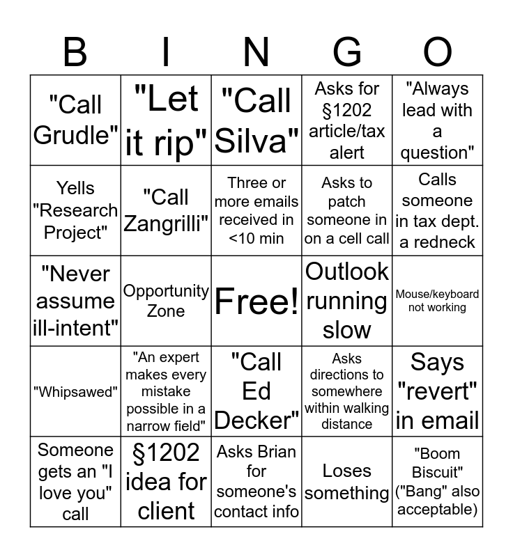 This bingo card has a free space and 30 words: §1202 idea for client, Solar Credits, Opportunity Zone, Casualty losses, "Call Grudle", "Call Silva", "Call Zangrilli", "Call Ed Decker", Outlook running slow, Asks Brian for someone's contact info, Mouse/keyboard not working, "Boom Biscuit" ("Bang" also acceptable), Loses something, Refers to some as the "Guru", Calls someone in tax dept. a redneck, Rolls in with Zaxby's, Asks directions to somewhere within walking distance, "Whipsawed", "An expert makes every mistake possible in a narrow field", "Always lead with a question", "Never assume ill-intent", Asks if someone has his copy of "How to be a CEO", "Let it rip", Asks to patch someone in on a cell call, Yells "Research Project", Asks for §1202 article/tax alert, Says "revert" in email, Someone gets an "I love you" call, Three or more emails received in <10 min and "Gentleman, and (insert name)".