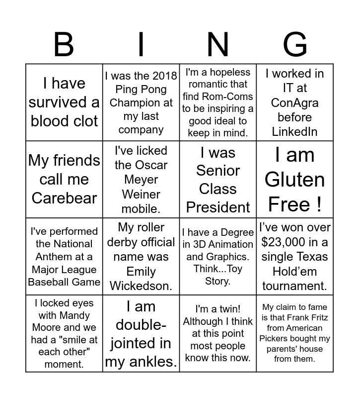 This bingo card has 86 words: I once climbed a 70 ft tree and photographed baby eagles in their nest, One of my children is older than Adam Harner, I have 3 lb Maltipoo dog named Jack who sings along to songs, especially Happy Birthday :), I read and study a lot about Plantagenet, Tudor, and Stuart-era history., I held my high school record for the 400 hurdles, I won a car once., I got married in Costa Rica, My ketchup usage angers everyone I've ever met, I've seen all major bodies of water in the United States, lakes included!, I feel very strongly that it's never too cold for ice cream or cold brew/iced coffee., My grandfather was awarded the congressional gold medal for being an ace fighter pilot in WWII., I like bananas but don't like the banana flavored runts, I have 3 dogs - all Miniature Australian Shepherds., I'm a twin! Although I think at this point most people know this now., I've been a teacher, a choir director, managed child care at a domestic violence shelter and a car salesman, I am Gluten Free !, I used to compete in pageants, I am ordained to perform wedding, funerals, and baptisms., My first car was a Suzuki Samurai! Loved that car!, I used to have pet rats names Nishibi and Dakota. They are not as gross as you think!, I LOVE to play games like Chess, Catan, Dominoes, ect, I have twins, I have a Degree in 3D Animation and Graphics. Think...Toy Story., Nerf wars are a regular occurrence in my house, The man who voices Mario once encouraged me to get into Voice Acting when I was a teenager. I ignored his advice., When I was born I had to be put into toddler clothes, not newborn (I was THAT big)., I once got into an accident with a police officer and it wasn't my fault!, My grandparents owned a newspaper, I have traveled to 5 of the 7 continents: I have not made it to Australia , or Antarctica., Almost became a jockey, I cheered in the NFL for 4 seasons, I have a profile on IMDb, I have won a National Championship in Figure Skating (roller), When I was a kid I wanted to be a diplomat., I've licked the Oscar Meyer Weiner mobile., My childhood crush was JTT (Jonathan Taylor Thomas) - even had a poster of him up in my room, My roller derby official name was Emily Wickedson., When I was 6, found a baby robin on the ground, took him home and raised him until he was an adult., I was an extra in Citizen Ruth., I’ve won over $23,000 in a single Texas Hold’em tournament., My wife and I once hung out with the band The Gin Blossoms for several hours after a concert., I have a twin brother, I have deadlifted 575 lbs., I am double-jointed in my ankles., I played, coached and officiated both baseball and hockey, My friends call me Carebear, My SO and I were set up by someone neither of us liked (and still don't), I was the 2018 Ping Pong Champion at my last company, When I worked at a bank, we got robbed at gun point., I'm an aunt of triplets, My cat is famous, I broke one of my bones playing ultimate frisbee (I take the ultimate part very seriously)., My claim to fame is that Frank Fritz from American Pickers bought my parents' house from them., I toured the US with a metal band as a tech for about a year. We toured with bands like Slipknot for the majority of the year., I've never lived anywhere else except for Omaha, My wife and I got married on a beach in Hawaii., My second fun fact is that I'm horrible at thinking of a second fun fact., I've performed the National Anthem at a Major League Baseball Game, I worked in IT at ConAgra before LinkedIn, I was Senior Class President, I have survived a blood clot, One of my favorite vacations was to Alaska <3, I used to play softball (Catcher) and soccer (Goalie) and in the same year I did not allow a stolen base or a goal! Yes...it was a very long time ago. Glory days!!, I have a 17 year old Shitzu who is blind AND deaf, I was in a Diamond Vogel Paint commercial when I was 12, I'm a hopeless romantic that find Rom-Coms to be inspiring a good ideal to keep in mind., DIY projects bring out my best and worst moments in life., I locked eyes with Mandy Moore and we had a "smile at each other" moment., I ate my pet goat when I was 9 years old., I hold a state powerlifting record., I own 18 different types of Vice Grips, I once held a job that allowed me to rappel from helicopters, Dreadfully afraid of deep water and spiders., I have swam in the Baltic Sea, I can play over 10 different musical instruments, I have 3 kids, from middle child to youngest there's a 10yr age gap..., I'm deathly afraid of cockroaches and rats., I used to drink an entire 2-liter of Mountain Dew by lunch-time every single day., I don't like dark chocolate, like hard pass!, I can learn country line dances very quickly... and generally forget them just as fast!, My great-great grandfather was President Lincoln's bodyguard at the Gettysburg Address in 1863, I unfortunately saw Kathy Bates naked in real life. It was traumatizing., I was a bookie for 5 years., I was an employee of Omaha Steaks for 4 Hours., My favorite rapper Ludacris and I have won a fishing tournament.
