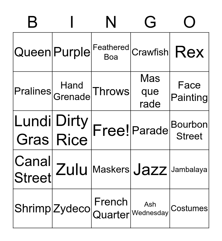 This bingo card has a free space and 24 words: Zulu, Zydeco, Throws, Shrimp, Rex, Queen, Pralines, Purple, Parade, Maskers, Mas que rade, Lundi Gras, Jazz, Jambalaya, Hand Grenade, Ash Wednesday, Bourbon Street, Feathered Boa, Face Painting, Dirty Rice, Costumes, Canal Street, Crawfish and French Quarter.