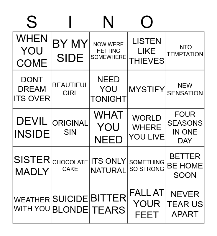 This bingo card has 25 words: CHOCOLATE CAKE, BITTER TEARS, NEED YOU TONIGHT, WEATHER WITH YOU, INTO TEMPTATION, WHEN YOU COME, DONT DREAM ITS OVER, BY MY SIDE, WORLD WHERE YOU LIVE, ITS ONLY NATURAL, MYSTIFY, DEVIL INSIDE, SOMETHING SO STRONG, BETTER BE HOME SOON, BEAUTIFUL GIRL, NEVER TEAR US APART, FOUR SEASONS IN ONE DAY, NOW WERE HETTING SOMEWHERE, NEW SENSATION, ORIGINAL SIN, WHAT YOU NEED, SUICIDE BLONDE, SISTER MADLY, LISTEN LIKE THIEVES and FALL AT YOUR FEET.
