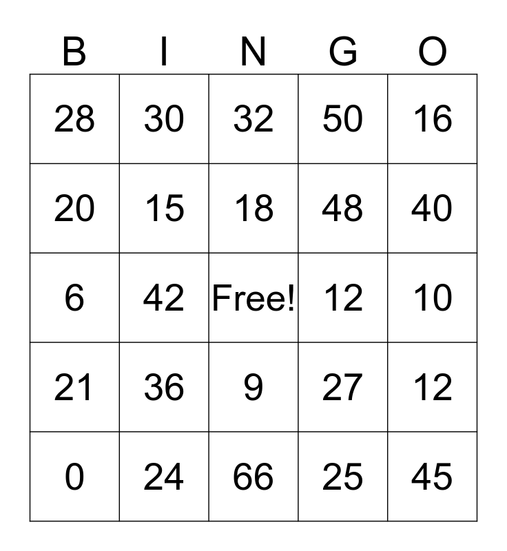 This bingo card has a free space and 24 words: 36, 24, 18, 0, 16, 28, 20, 30, 12, 9, 48, 6, 27, 12, 15, 25, 10, 32, 40, 42, 45, 21, 50 and 66.