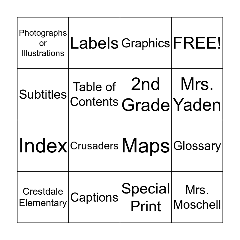 This bingo card has 16 words: Captions, Glossary, Graphics, Photographs or Illustrations, Index, Labels, Maps, Special Print, Subtitles, Table of Contents, Crestdale Elementary, FREE!, Crusaders, Mrs. Yaden, 2nd Grade and Mrs. Moschell.