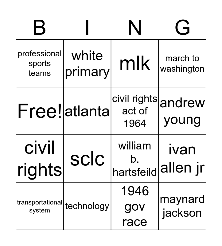 This bingo card has 16 words: technology, ivan allen jr, mlk, professional sports teams, civil rights, white primary, william b. hartsfeild, 1946 gov race, Free!, atlanta, transportational system, march to washington, sclc, andrew young, civil rights act of 1964 and maynard jackson.
