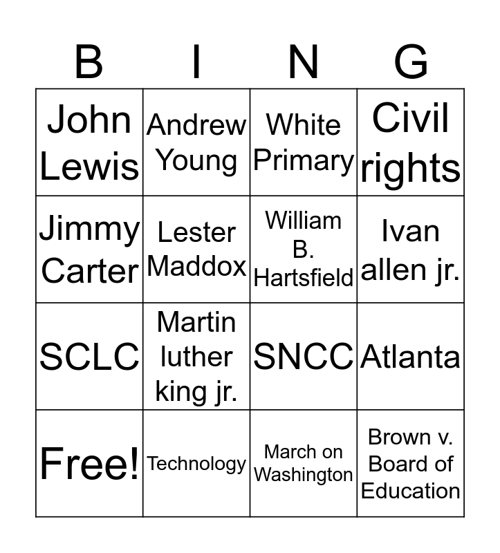 This bingo card has 16 words: Technology, Atlanta, White Primary, John Lewis, SCLC, Andrew Young, SNCC, March on Washington, Jimmy Carter, Lester Maddox, Free!, Civil rights, Martin luther king jr., Ivan allen jr., William B. Hartsfield and Brown v. Board of Education.