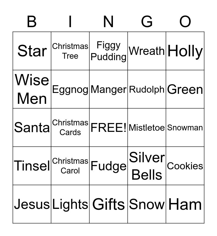 This bingo card has a free space and 24 words: Christmas Carol, Lights, Manger, Jesus, Holly, Star, Wise Men, Christmas Tree, Mistletoe, Fudge, Rudolph, Santa, Silver Bells, Cookies, Eggnog, Snow, Snowman, Figgy Pudding, Green, Christmas Cards, Ham, Tinsel, Wreath and Gifts.