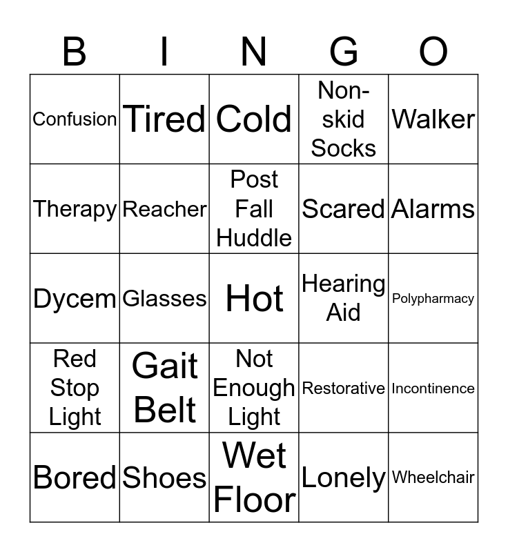 This bingo card has a free space and 28 words: Incontinence, Hungry, Scared, Lonely, Therapy, Cold, Tired, Red Stop Light, Hearing Aid, Bored, Dycem, Non-skid Socks, Shoes, Wet Floor, Alarms, Thirsty, Gait Belt, Reacher, Post Fall Huddle, Not Enough Light, Confusion, Bevel Mat, Wheelchair, Glasses, Polypharmacy, Restorative, Walker and Weakness.