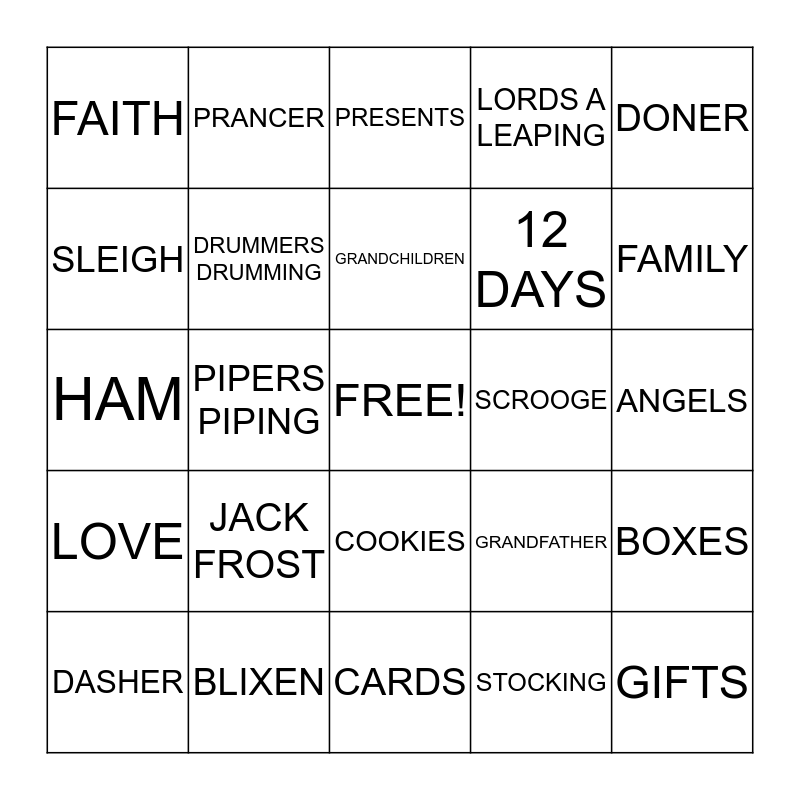 This bingo card has a free space and 24 words: JACK FROST, BLIXEN, GRANDCHILDREN, DASHER, DONER, FAITH, SLEIGH, PRANCER, SCROOGE, COOKIES, 12 DAYS, HAM, GRANDFATHER, BOXES, DRUMMERS DRUMMING, STOCKING, ANGELS, PRESENTS, FAMILY, PIPERS PIPING, GIFTS, LOVE, LORDS A LEAPING and CARDS.
