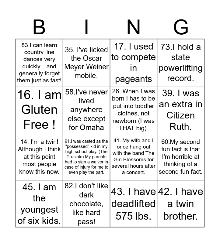 This bingo card has 92 words: 1. I once climbed a 70 ft tree and photographed baby eagles in their nest, 2. One of my children is older than Adam Harner, 3. I have 3 lb Maltipoo dog named Jack who sings along to songs, especially Happy Birthday :), 4. I read and study a lot about Plantagenet, Tudor, and Stuart-era history., 5. I held my high school record for the 400 hurdles, 6. I won a car once., 7. I got married in Costa Rica, 8. My ketchup usage angers everyone I've ever met, 9. I've seen all major bodies of water in the United States, lakes included!, 10. I feel very strongly that it's never too cold for ice cream or cold brew/iced coffee., 11. My grandfather was awarded the congressional gold medal for being an ace fighter pilot in WWII., 12. I like bananas but don't like the banana flavored runts, 13. I have 3 dogs - all Miniature Australian Shepherds., 14. I'm a twin! Although I think at this point most people know this now., 15. I've been a teacher, a choir director, managed child care at a domestic violence shelter and a car salesman, 16. I am Gluten Free !, 17. I used to compete in pageants, 18. I am ordained to perform wedding, funerals, and baptisms., 19. My first car was a Suzuki Samurai! Loved that car!, 20. I used to have pet rats names Nishibi and Dakota. They are not as gross as you think!, 21. I LOVE to play games like Chess, Catan, Dominoes, ect, 22. I have twins, 23. I have a Degree in 3D Animation and Graphics. Think...Toy Story., 24. Nerf wars are a regular occurrence in my house, 25. The man who voices Mario (y'know, from the Mario video game franchise) once encouraged me to get into Voice Acting when I was a teenager. I ignored his advice., 26. When I was born I has to be put into toddler clothes, not newborn (I was THAT big)., 27. I once got into an accident with a police officer and it wasn't my fault!, 28. My grandparents owned a newspaper, 29. I have traveled to 5 of the 7 continents: I have not made it to Australia , or Antarctica., 30. Almost became a jockey, 31. I cheered in the NFL for 4 seasons, 32. I have a profile on IMDb, 33. I have won a National Championship in Figure Skating (roller), 34. When I was a kid I wanted to be a diplomat., 35. I've licked the Oscar Meyer Weiner mobile., 36. My childhood crush was JTT (Jonathan Taylor Thomas) - even had a poster of him up in my room, 37. My roller derby official name was Emily Wickedson., 38. When I was 6, found a baby robin on the ground, took him home and raised him until he was an adult., 39. I was an extra in Citizen Ruth., 40. I’ve won over $23,000 in a single Texas Hold’em tournament., 41. My wife and I once hung out with the band The Gin Blossoms for several hours after a concert., 42. I have a twin brother., 43. I have deadlifted 575 lbs., 44. I hold the record at my high school for the 300 meter hurdles., 45. I am the youngest of six kids., 46. I love pickle flavored popcorn., 47.I am double-jointed in my ankles., 48.I played, coached and officiated both baseball and hockey, 49.My friends call me Carebear, 50.My SO and I were set up by someone neither of us liked (and still don't), 51.I was the 2018 Ping Pong Champion at my last company, 52.When I worked at a bank, we got robbed at gun point., 53.I'm an aunt of triplets, 54.My cat is famous, 55.I broke one of my bones playing ultimate frisbee (I take the ultimate part very seriously)., 56.My claim to fame is that Frank Fritz from American Pickers bought my parents' house from them., 57.I toured the US with a metal band as a tech for about a year. We toured with bands like Slipknot for the majority of the year., 58.I've never lived anywhere else except for Omaha, 59.My wife and I got married on a beach in Hawaii., 60.My second fun fact is that I'm horrible at thinking of a second fun fact., 61.I've performed the National Anthem at a Major League Baseball Game, 62.I worked in IT at ConAgra before LinkedIn, 63.I was Senior Class President, 64.I have survived a blood clot, 65.One of my favorite vacations was to Alaska <3, 66.I used to play softball (Catcher) and soccer (Goalie) and in the same year I did not allow a stolen base or a goal! Yes...it was a very long time ago. Glory days!!, 67.I have a 17 year old Shitzu who is blind AND deaf, 68.I was in a Diamond Vogel Paint commercial when I was 12, 69.I'm a hopeless romantic that find Rom-Coms to be inspiring a good ideal to keep in mind., 70.DIY projects bring out my best and worst moments in life., 71.I locked eyes with Mandy Moore and we had a "smile at each other" moment., 72.I ate my pet goat when I was 9 years old., 73.I hold a state powerlifting record., 74.I own 18 different types of Vice Grips, 75.I once held a job that allowed me to rappel from helicopters, 76.Dreadfully afraid of deep water and spiders., 77.I have swam in the Baltic Sea, 78.I can play over 10 different musical instruments, 79.I have 3 kids, from middle child to youngest there's a 10yr age gap..., 80.I'm deathly afraid of cockroaches and rats., 81.I used to drink an entire 2-liter of Mountain Dew by lunch-time every single day., 82.I don't like dark chocolate, like hard pass!, 83.I can learn country line dances very quickly... and generally forget them just as fast!, 84.My great-great grandfather was President Lincoln's bodyguard at the Gettysburg Address in 1863, 85.I unfortunately saw Kathy Bates naked in real life. It was traumatizing., 86.I was a bookie for 5 years, 87.I was an employee of Omaha Steaks for 4 Hours, 88.My favorite rapper Ludacris, 89.I have won a fishing tournament, 90.I was on the dance team in college., 91.I was casted as the "possessed" kid in my high school play. (The Crucible) My parents had to sign a waiver in case of injury for me to even play the part. and 92.My favorite podcasts are Armchair Expert and My Favorite Murder..