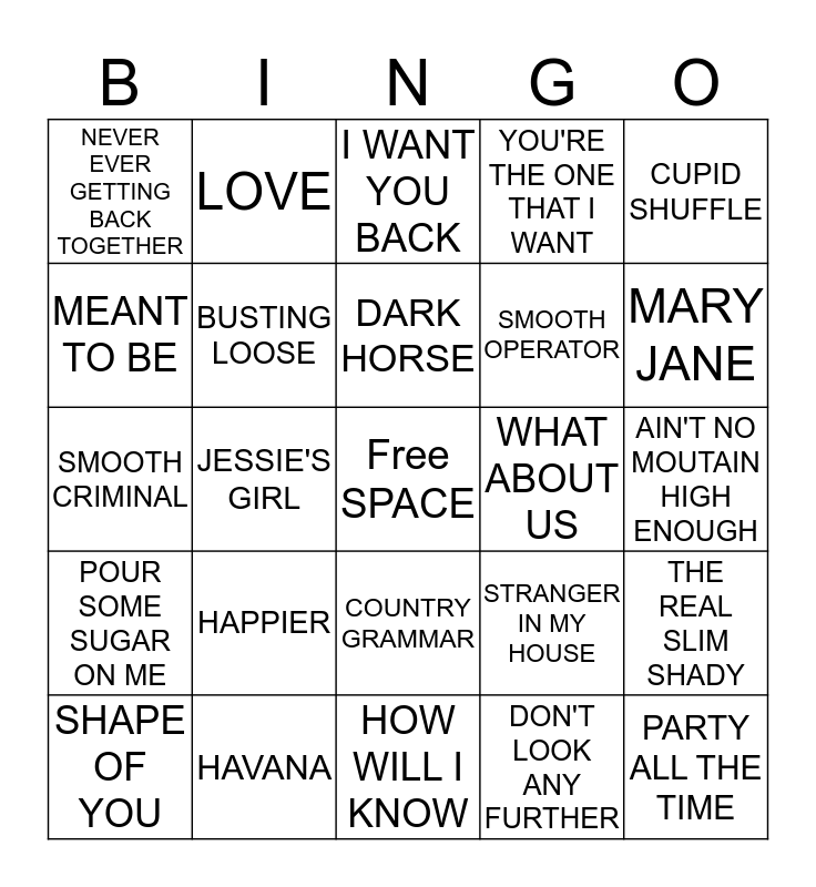 This bingo card has a free space and 24 words: HAPPIER, HAVANA, DARK HORSE, SHAPE OF YOU, CUPID SHUFFLE, NEVER EVER GETTING BACK TOGETHER, MEANT TO BE, LOVE, WHAT ABOUT US, COUNTRY GRAMMAR, SMOOTH OPERATOR, SMOOTH CRIMINAL, STRANGER IN MY HOUSE, THE REAL SLIM SHADY, BUSTING LOOSE, DON'T LOOK ANY FURTHER, AIN'T NO MOUTAIN HIGH ENOUGH, I WANT YOU BACK, MARY JANE, JESSIE'S GIRL, PARTY ALL THE TIME, POUR SOME SUGAR ON ME, YOU'RE THE ONE THAT I WANT and HOW WILL I KNOW.