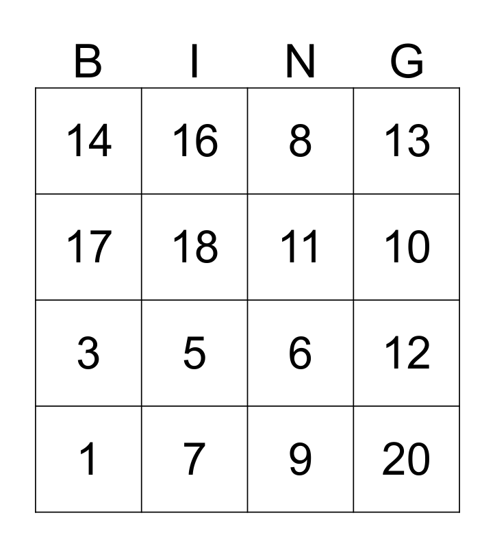 This bingo card has 20 words: 1, 4, 8, 12, 2, 5, 9, 13, 3, 16, 6, 10, 14, 7, 11, 15, 17, 18, 19 and 20.