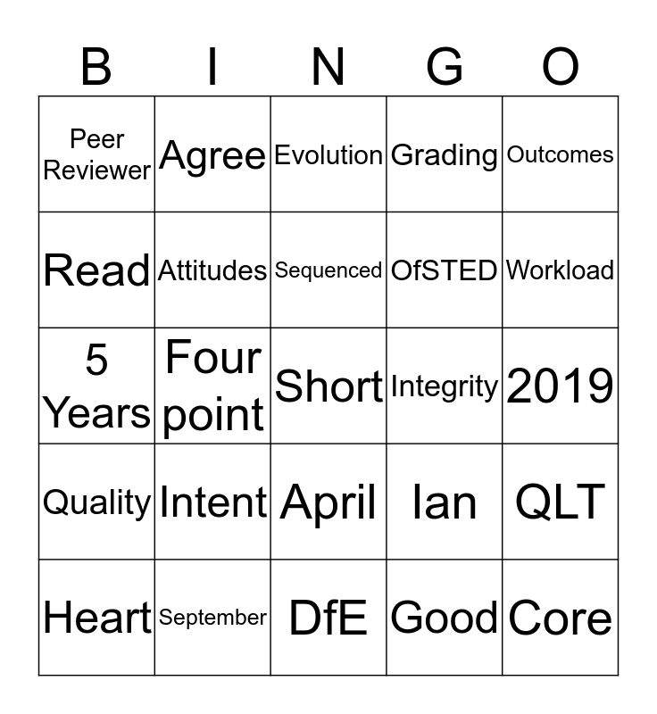 This bingo card has a free space and 24 words: Intent, September, Sequenced, Heart, Outcomes, Peer Reviewer, Read, Agree, Integrity, April, OfSTED, 5 Years, Ian, QLT, Attitudes, Good, 2019, Evolution, Workload, Four point, Core, Quality, Grading and DfE.