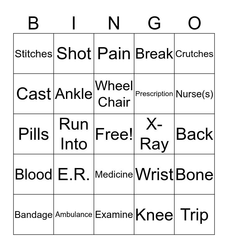This bingo card has a free space and 24 words: E.R., Ambulance, Wheel Chair, Bandage, Crutches, Stitches, Cast, Shot, X-Ray, Medicine, Prescription, Pills, Wrist, Bone, Ankle, Knee, Back, Pain, Nurse(s), Run Into, Trip, Blood, Break and Examine.