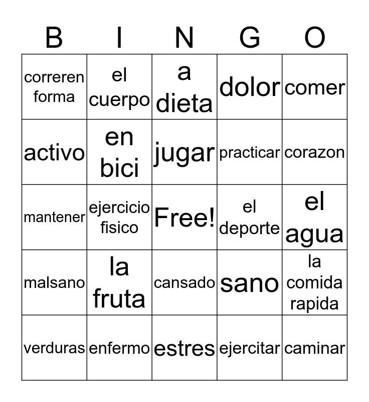 This bingo card has a free space and 24 words: verduras, la fruta, jugar, ejercitar, comer, correren forma, el cuerpo, a dieta, el deporte, el agua, mantener, en bici, sano, la comida rapida, activo, enfermo, estres, dolor, corazon, malsano, ejercicio fisico, cansado, practicar and caminar.