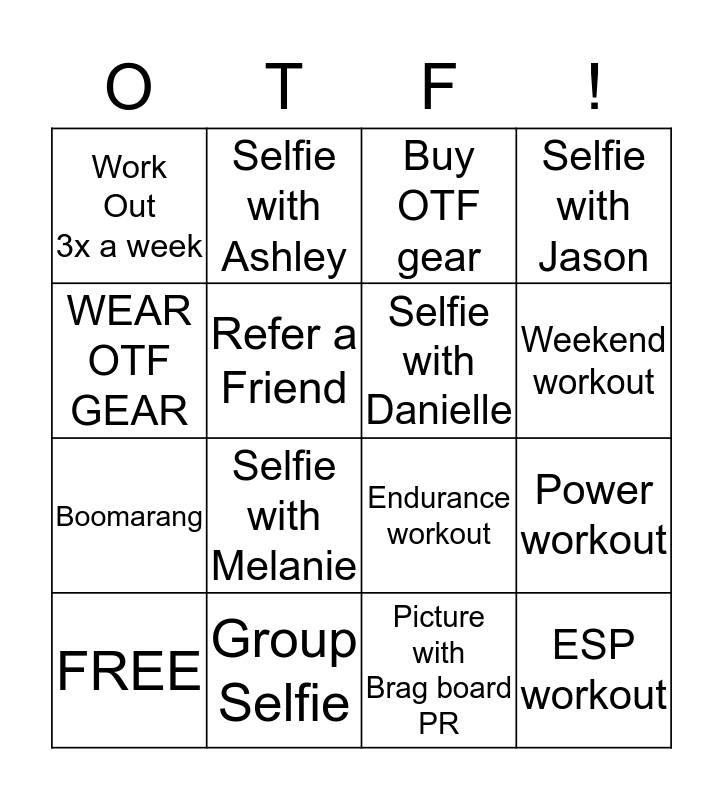 This bingo card has 16 words: Group Selfie, Power workout, Buy OTF gear, Work Out 3x a week, Boomarang, Selfie with Ashley, Endurance workout, Picture with Brag board PR, WEAR OTF GEAR, Refer a Friend, FREE, Selfie with Jason, Selfie with Melanie, Weekend workout, Selfie with Danielle and ESP workout.