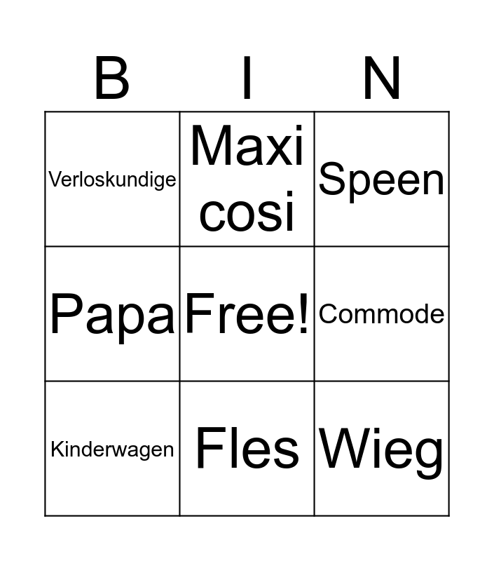 This bingo card has a free space and 9 words: Kinderwagen, Fles, Speen, Verloskundige, Maxi cosi, Commode, Papa, Mama and Wieg.