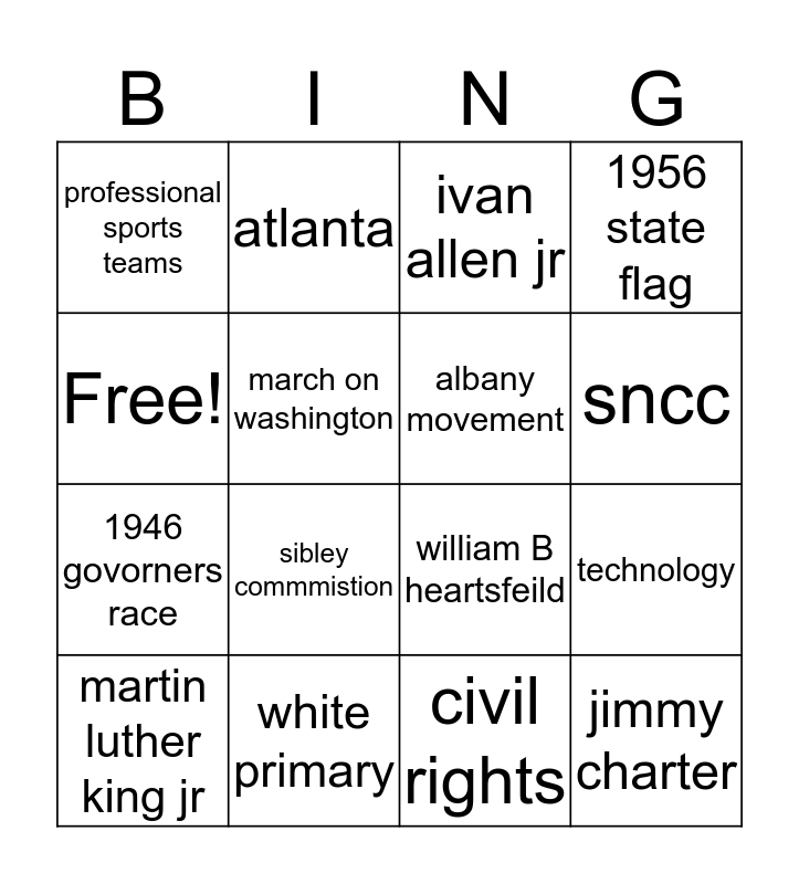 This bingo card has 16 words: white primary, technology, ivan allen jr, professional sports teams, 1946 govorners race, atlanta, william B heartsfeild, civil rights, Free!, march on washington, martin luther king jr, 1956 state flag, sibley commmistion, sncc, albany movement and jimmy charter.