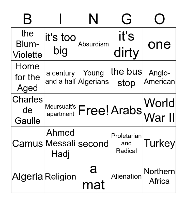 This bingo card has a free space and 29 words: Algeria, the beach, Meursualt's apartment, the French, the Blum-Violette, Absurdism, a century and a half, Ahmed Messali Hadj, Arabs, Religion, World War II, Northern Africa, a mat, Alienation, Anglo-American, Ferhat Abbas, second, Camus, one, Charles de Gaulle, Proletarian and Radical, a bucket, the bus stop, Home for the Aged, it's dirty, it's too big, Turkey, Young Algerians and nationalism without nuance.