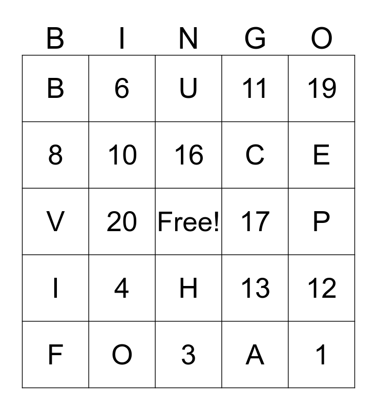 This bingo card has a free space and 47 words: 0, 1, 2, 3, 4, 5, 6, 7, 8, 9, 10, 11, 12, 13, 14, 15, 16, 17, 18, 19, 20, A, B, C, D, E, F, G, H, I, J, K, L, M, N, O, P, Q, R, S, T, U, V, W, X, Y and Z.