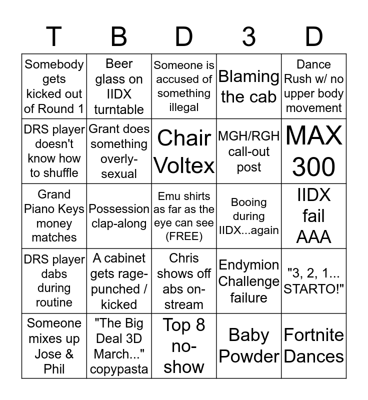 This bingo card has a free space and 24 words: A cabinet gets rage-punched / kicked, "The Big Deal 3D March..." copypasta, Chair Voltex, Someone mixes up Jose & Phil, Dance Rush w/ no upper body movement, Somebody gets kicked out of Round 1, DRS player doesn't know how to shuffle, Beer glass on IIDX turntable, Booing during IIDX...again, Chris shows off abs on-stream, MGH/RGH call-out post, Grand Piano Keys money matches, Endymion Challenge failure, "3, 2, 1... STARTO!", Grant does something overly-sexual, Baby Powder, IIDX fail AAA, Someone is accused of something illegal, MAX 300, Possession clap-along, Fortnite Dances, DRS player dabs during routine, Blaming the cab and Top 8 no-show.