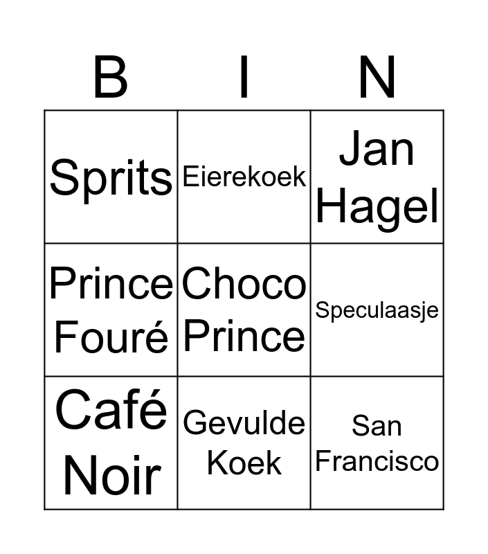 This bingo card has 32 words: Bastogne, Bitterkoekje, Bokkepootje, Boterkoek, Brusselse Kermis, Café Noir, Choco Prince, Dennekoek, Eierekoek, Frou Frou, Gevulde Koek, Jan Hagel, Jodenkoek, Kattetongen, Kletskop, Knappertje, Kokosmakroon, Krakeling, Langetjes, Lange vinger, Maria Biscuit, Mergpijpje, Mouselientje/Roze Koek, Pennywafel, Pindakoek, Prince Fouré, San Francisco, Speculaasje, Sprits, Stroopwafel, Volkorenkoek/Digestive and Weespermop.