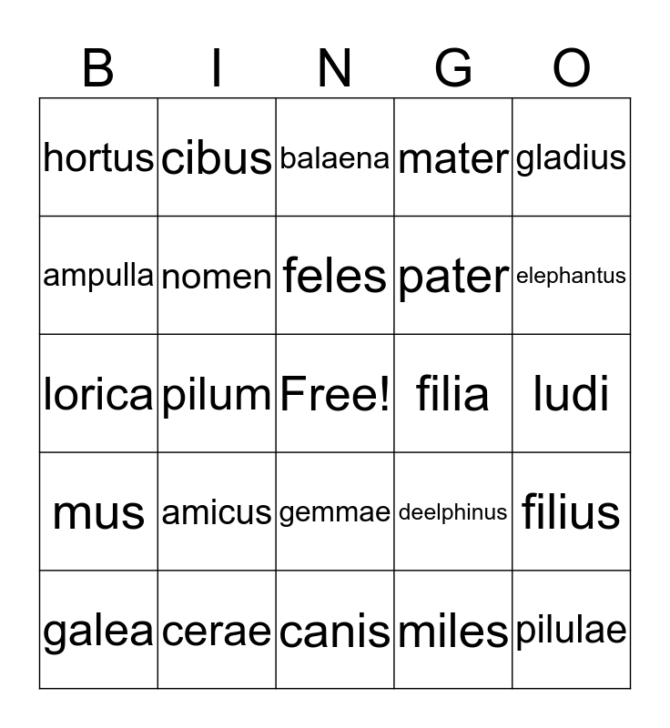 This bingo card has a free space and 24 words: amicus, cerae, feles, galea, gladius, hortus, ampulla, cibus, filia, gemmae, pater, lorica, deelphinus, filius, nomen, miles, ludi, balaena, elephantus, pilum, pilulae, mus, mater and canis.