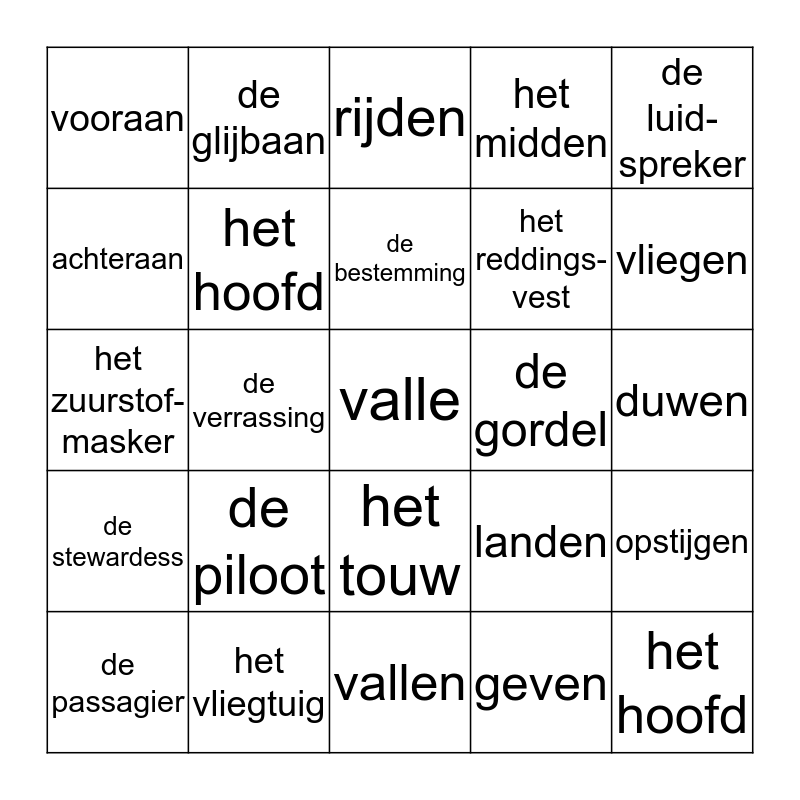 This bingo card has a free space and 24 words: de piloot, het vliegtuig, de bestemming, de passagier, de luid- spreker, vooraan, achteraan, de glijbaan, de gordel, het touw, het reddings- vest, het zuurstof- masker, landen, opstijgen, het hoofd, geven, duwen, rijden, vliegen, de verrassing, het hoofd, de stewardess, het midden and vallen.